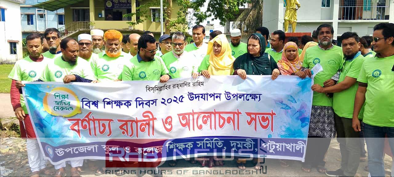 ‘বিশ্ব শিক্ষক দিবস’ উপলক্ষে পটুয়াখালীর দুমকিতে উপজেলা স্কুল ও কলেজ শিক্ষক সমিতির আয়োজনে এক বর্ণাঢ্য র‍্যালি ও আলোচনা সভা অনুষ্ঠিত হয়েছে। শিক্ষাবিদ, শিক্ষক নেতা এবং প্রশাসনের কর্মকর্তাদের অংশগ্রহণে দিনটি ছিল উৎসবমুখর।