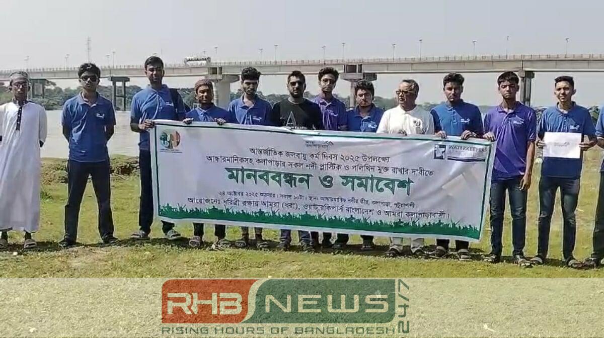 আন্তর্জাতিক জলবায়ু কর্ম দিবস উপলক্ষে নদী প্লাষ্টিক ও পলিথিন মুক্ত রাখার দাবিতে পটুয়াখালীর কলাপাড়ায় মানববন্ধন অনুষ্ঠিত হয়েছে। শুক্রবার বেলা এগারোটায় ধরিত্রী রক্ষায় আমরা (ধরা), ওয়াটারকিপার্স বাংলাদেশ ও আমরা কলাপাড়াবাসীর আয়োজনে কলাপাড়া সরকারী মডেল মাধ্যমিক বিদ্যালয় সংলগ্ন আন্ধারমানিক নদীর তীরে এ মানববন্ধন অনুষ্ঠিত হয়। এসময় বক্তব্য রাখেন কলাপাড়া প্রেসক্লাবের সাবেক সভাপতি মেজবাহ উদ্দিন মাননু, সংস্কৃতি কর্মী তানজিল জয় ও আমরা কলাপাড়াবাসীর সাবেক সভাপতি নজরুলসহ সংগঠনটির সদস্যরা।