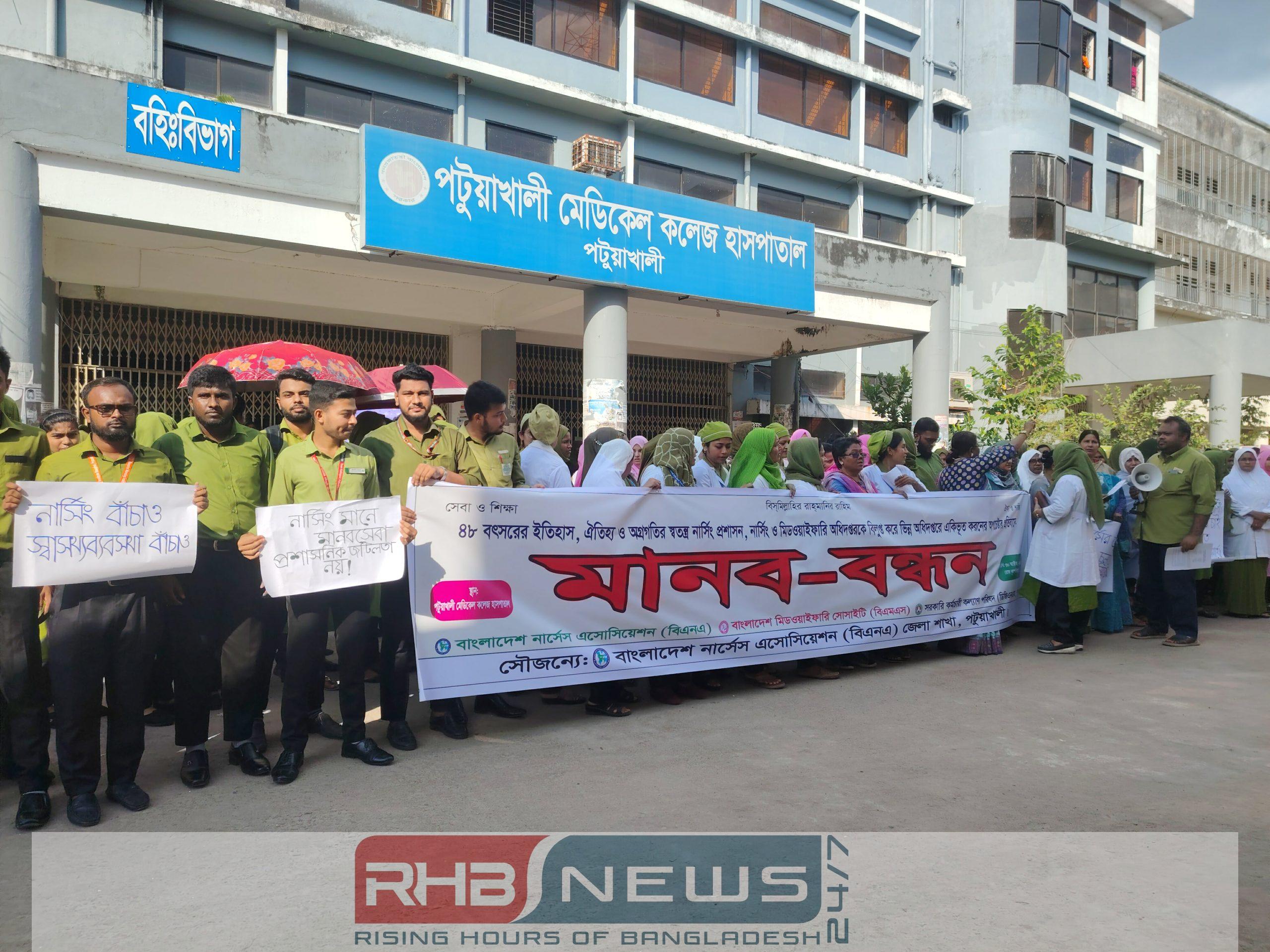 ৪৮ বছরের ঐতিহ্যবাহী ও স্বতন্ত্র প্রশাসনিক কাঠামো “নার্সিং ও মিডওয়াইফারি অধিদপ্তর” বিলুপ্ত করে ভিন্ন অধিদপ্তরে একীভূত করার উদ্যোগের প্রতিবাদে ঢাকাসহ দেশের সব জেলায় একযোগে মানববন্ধন কর্মসূচি পালন করেছে নার্স, মিডওয়াইফ ও সংশ্লিষ্ট সংগঠনগুলো। বৃহস্পতিবার (৩০ অক্টোবর) দুপুর ২টায় পটুয়াখালী মেডিকেল কলেজ হাসপাতালের সামনে অনুষ্ঠিত মানববন্ধনে বক্তারা এই সিদ্ধান্তকে “জনস্বার্থবিরোধী ও পেশার স্বকীয়তা ধ্বংসের অপচেষ্টা” বলে আখ্যা দেন এবং অবিলম্বে তা প্রত্যাহারের দাবি জানান।