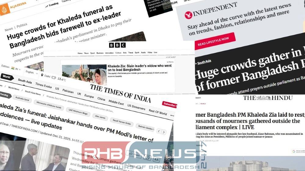 বাংলাদেশের তিনবারের সাবেক প্রধানমন্ত্রী ও বিএনপি চেয়ারপারসন বেগম খালেদা জিয়ার রাষ্ট্রীয় জানাজা বুধবার (৩১ ডিসেম্বর) বিকেল ৩টায় জাতীয় সংসদ ভবনের দক্ষিণ প্লাজা ও মানিক মিয়া অ্যাভিনিউয়ে সম্পন্ন হয়েছে। লাখো মানুষের অশ্রুসিক্ত বিদায় শেষে তাকে শেরেবাংলা নগরে স্বামী শহীদ রাষ্ট্রপতি জিয়াউর রহমানের কবরের পাশে সমাহিত করা হয়। বাংলাদেশের রাজনীতির অন্যতম এই মহীয়সী নারীর প্রয়াণ ও বিশাল জানাজার খবরটি আন্তর্জাতিক গণমাধ্যমগুলোতে অত্যন্ত গুরুত্বের সঙ্গে স্থান পেয়েছে।